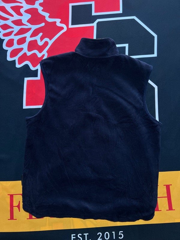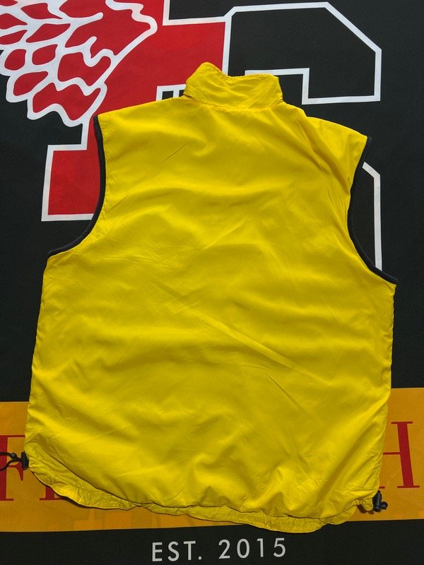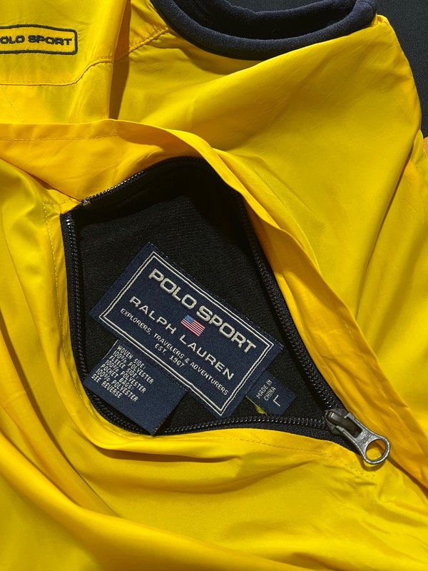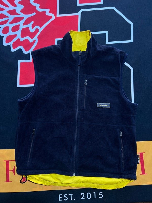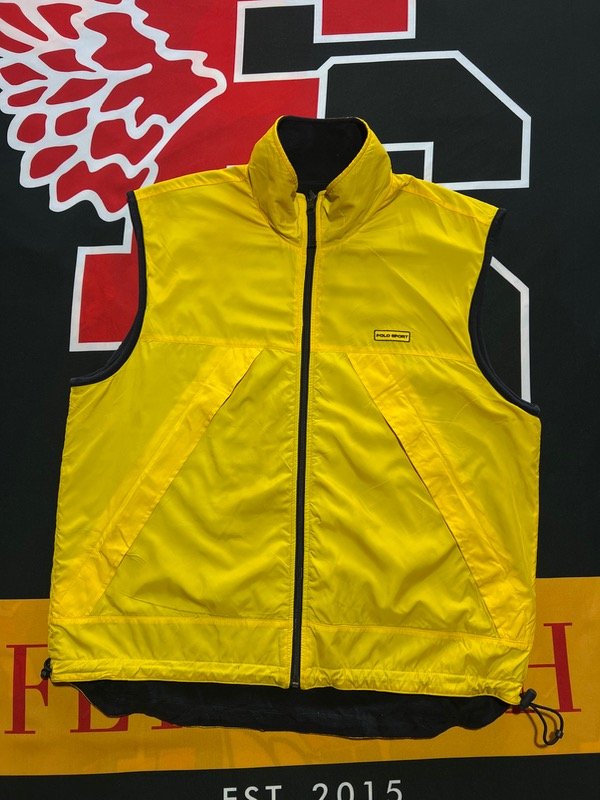 Chaleco Polo Sport reversible. La parte azul es polar y la amarilla rompeviento. Prenda vintage.